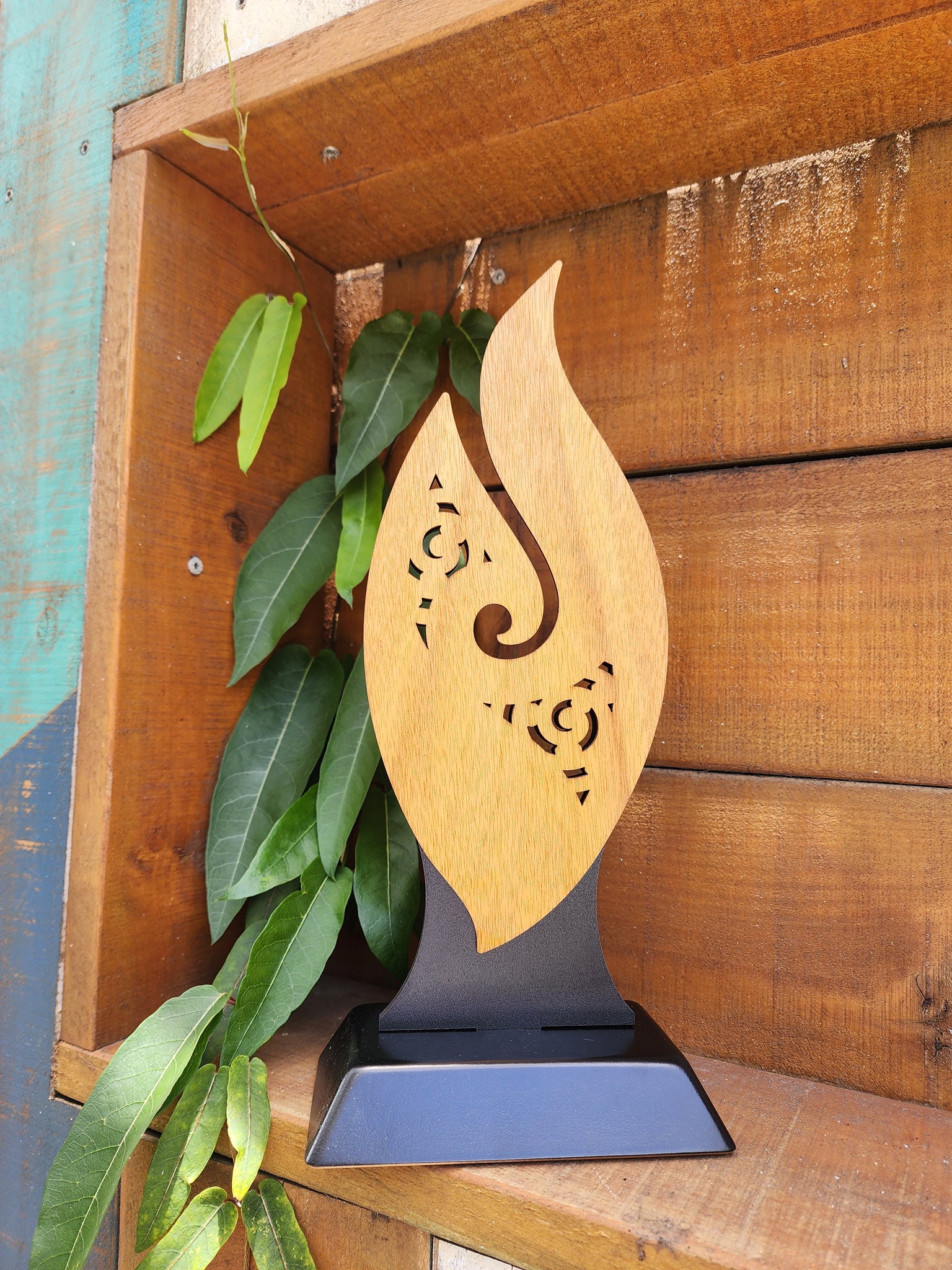 Large Standing Flame artwork (300mm high) hand-assembled and crafted from NZ Macrocarpa veneered MDF, plantation grown Gaboon and NZ Paua laminate using laser technology.